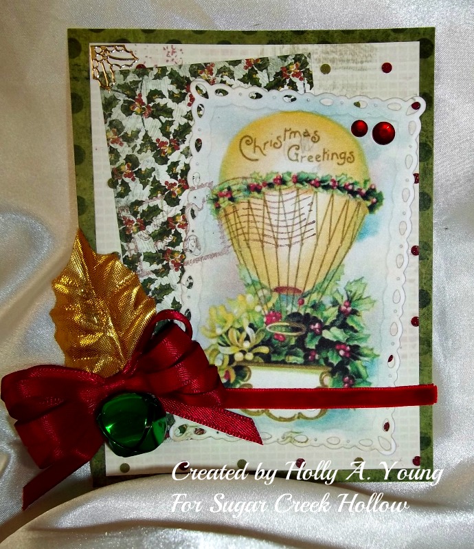 Papers are scraps,,,,,,I cut out the hot air balloon with Romantic Rectangles and accented with a red velvet ribbon, a green jingle bell and a gold holly leaf,,I also stamped the image with an itty bitty unity stamp,,,,,,easy peasy and simple as pie!